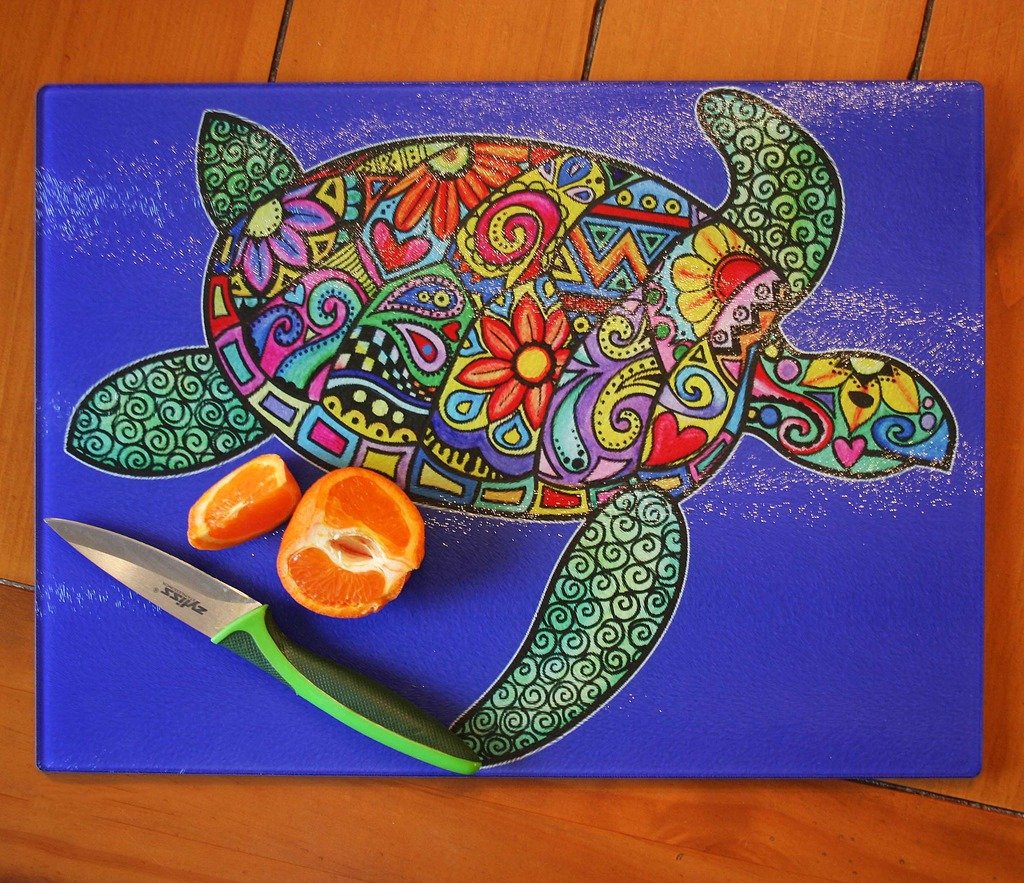 • The MeganJDesigns Sea Turtle Glass Cutting Board Tempered Glass Kitchen Chopping Board Colorful Beach House Home Decor Hippie Art Design Nautical Cutlery Gift is a