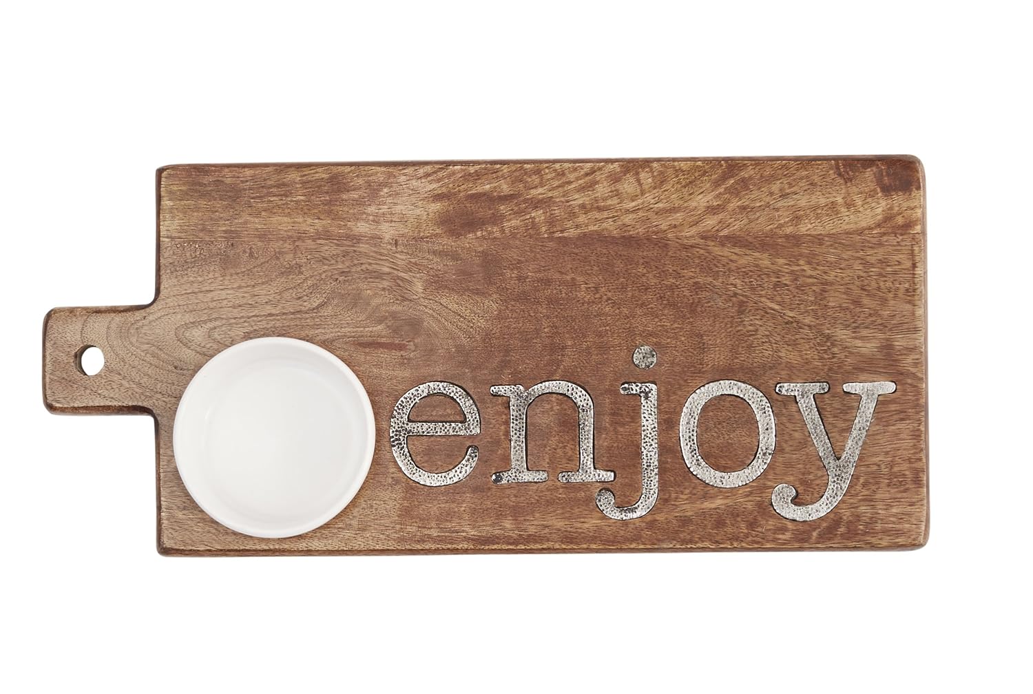 Made with Recyclable Bamboo. This cutting board is the ideal surface for food prep, chopping, slicing, and dicing.The porous bamboo surface is stronger and harder than alternative oak or maple wood cutting boards costing twice as much. Our bamboo carving board is large and sturdy enough to stand up to all your cooking needs, yet gentle enough to not dull your knives.Mud Pie "Enjoy" Cutting Board, Brown is best for youMango wood serving board from Mud Pie has a removable inset ceramic ramekin features textured cast aluminum inset 'enjoy' sentiment.