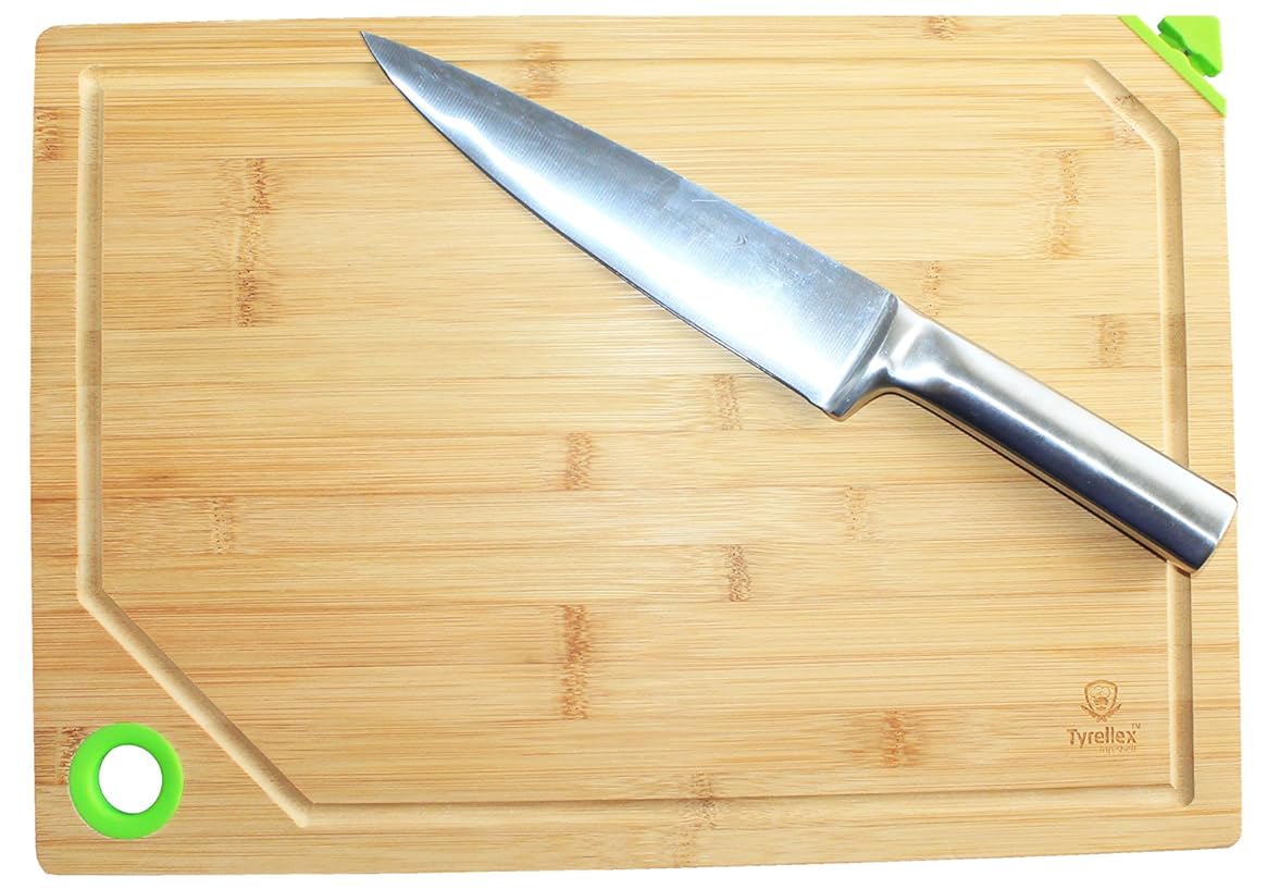 Made with Recyclable Bamboo. This cutting board is the ideal surface for food prep, chopping, slicing, and dicing.The porous bamboo surface is stronger and harder than alternative oak or maple wood cutting boards costing twice as much. Our bamboo carving board is large and sturdy enough to stand up to all your cooking needs, yet gentle enough to not dull your knives.Tyrellex Bamboo Cutting Board with Knife Sharpener and Juice Groove - Can Hang Dry is best for youPacked with features including a very handy knife sharpener, Eco-Friendly, Professional-Grade & 100% Organic Bamboo this Tyrellex cutting board will make your kitchen complete.
