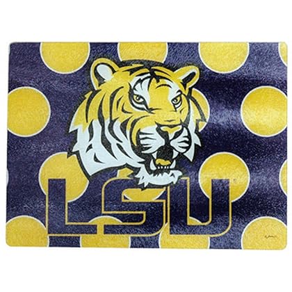 Made with Recyclable Bamboo. This cutting board is the ideal surface for food prep, chopping, slicing, and dicing.The porous bamboo surface is stronger and harder than alternative oak or maple wood cutting boards costing twice as much. Our bamboo carving board is large and sturdy enough to stand up to all your cooking needs, yet gentle enough to not dull your knives.NCAA LSU Tigers Cutting Board with Polka Dots and Team Logo is best for youOfficially licensed Team Cutting Board. Artfully crafted in Team Colors with Team logo. Excellent for use in the home, bar, man cave, or tailgating.