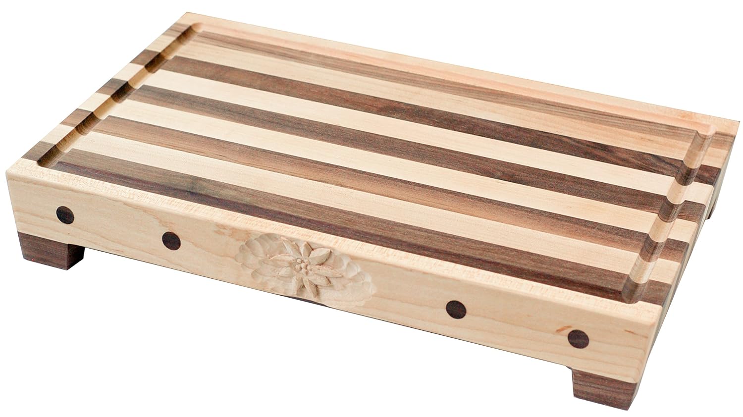 Made with Recyclable Bamboo. This cutting board is the ideal surface for food prep, chopping, slicing, and dicing.The porous bamboo surface is stronger and harder than alternative oak or maple wood cutting boards costing twice as much. Our bamboo carving board is large and sturdy enough to stand up to all your cooking needs, yet gentle enough to not dull your knives.Premium Wood Cutting Board with Maple and Walnut Stripes, Feet and Juice Groove for a Clean Cutting Experience is best for youColor:Walnut and Maple This exceptional cutting board has an alternating pattern of maple and walnut. It is made in the heart of Pennsylvania by Amish craftsmen and packaged in a box that tells the story of where it came from. This finely detailed butcher block cutting board has contrasting wood tones along the side, as well as feet to keep it up off of the counter a groove to catch drippings and a signature Edelweiss flower carved by hand into the front. Each cutting board comes with a card that can be filled out if it is being given as a gift. This is a beautiful hand crafted butcher block cutting board that will last years if properly cared for