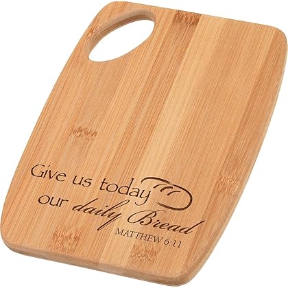 Made with Recyclable Bamboo. This cutting board is the ideal surface for food prep, chopping, slicing, and dicing.The porous bamboo surface is stronger and harder than alternative oak or maple wood cutting boards costing twice as much. Our bamboo carving board is large and sturdy enough to stand up to all your cooking needs, yet gentle enough to not dull your knives.Give Us This Day Our Daily Bread Matthew 6:11 Cutting Board 9 X 6 is best for youCutting Board Size: 6' W x 9' H These hardwood bamboo cutting boards are perfect for cutting fruit and vegetables, or simply leaving out for display. P. Graham Dunn is family owned and operated since 1976. Nestled in the heart of Amish Country, a business that was built on the hard work and dedication so often practiced within and around our surrounding community. To this day, continuing to practice these same qualities has allowed us to remain a growing manufacturer of American-made inspirational art, home décor, and gifts.