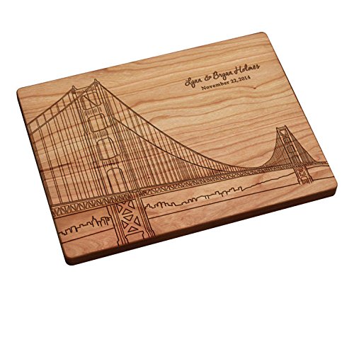 Made with Recyclable Bamboo. This cutting board is the ideal surface for food prep, chopping, slicing, and dicing.The porous bamboo surface is stronger and harder than alternative oak or maple wood cutting boards costing twice as much. Our bamboo carving board is large and sturdy enough to stand up to all your cooking needs, yet gentle enough to not dull your knives.Personalized Cutting Board - Golden Gate Bridge is best for youOur Golden Gate bridge skyline cutting board is a San Francisco favorite. Such a unique gift, you just won't find one like it anywhere else. Perfect for San Francisco weddings and housewarmings, also makes a great 'just because' gift for the native San Franciscan or San Franciscans at heart living abroad. • Choice of size includes: 16 x 11 x 3/4 in. or 12 x 9 x 3/4 in. (please select size from available options) • Engraved in the wood of your choice, per listed wood types. (please select wood type from available options) • Hand wash, do not soak cutting board in water. (Do NOT put in dishwasher) • Designed to be displayed on the engraved side, and fully functional for cutting, chopping, and slicing, on the reverse. PLEASE NOTE: We cannot replace or refund a product with a misspelling or error in the configuration, inscription, or design due to a mistake by customer error, as the item cannot be resold. (Personalization will be exactly as entered, so be sure to TRIPLE CHECK your customization.)