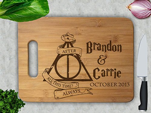 Made with Recyclable Bamboo. This cutting board is the ideal surface for food prep, chopping, slicing, and dicing.The porous bamboo surface is stronger and harder than alternative oak or maple wood cutting boards costing twice as much. Our bamboo carving board is large and sturdy enough to stand up to all your cooking needs, yet gentle enough to not dull your knives.After All This Time, Always Personalized Kitchen Bamboo Cutting Board is best for youAfter All this Time inspired Engraved Bamboo Cutting Board. Bamboo cutting boards are perfect for every food prep need,from slicing meat to chopping veggies, serve up appetizers or make cocktail garnishes. IMPORTANT: Each cutting board is unique. Engraving may not look even in some of the lighter areas of the wood. This is natural. We do try and make it as even as we can. This only just makes your product more unique and special.
