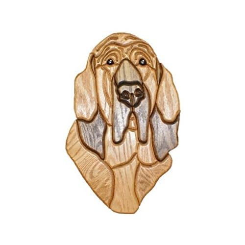 Silver Creek Bloodhound-Intarsia Wood Carving is best for youbloodhound. Intarsia wood carving, made by hand in wisconsin of native grown oak. Individual pieces are cut, shaped, sanded, stained, and then glued onto a plywood backing. Natural graining of the wood makes each item unique. Measures approximately 8' wide x 13' high, es ready to hang on your wall.