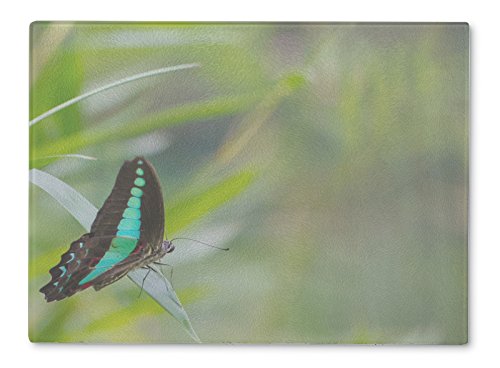 Gear New Cutting Board, Common Jay Butterfly In A Garden, 11x8 is best for youSize:11.25 inches by 8 inches | Color:Multi This Gear New glass cutting board is designed to beautify not only beautify your kitchen but is a safe and easy to clean cutting surface.The tempered glass is built with a random pattern of tiny undulations which helps the surface work better for cutting. The artwork is actually on the under side of the glass so there is no risk that you will damage the beautiful design.The board also comes with small rubber feet on the corners to help stabilize it on your counter top and keep it from slipping.It is easy to clean with hot water and soap or you can even put it in the dishwasher.Return Policy: Gear New operates with the same 30 day return policy as Amazon, but please note that since each cutting board is made to order, after you order, there is a 20% restocking fee if the item is returned for any reason other than damage. You are also responsible for return shipping.