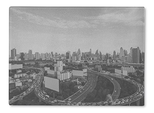 Gear New Cutting Board, Black White Aerial View Highway Road Curved City Downtown, 15x11 is best for youSize:15.5 inches by 11.25 inches | Color:Multi This Gear New glass cutting board is designed to beautify not only beautify your kitchen but is a safe and easy to clean cutting surface.The tempered glass is built with a random pattern of tiny undulations which helps the surface work better for cutting. The artwork is actually on the under side of the glass so there is no risk that you will damage the beautiful design.The board also comes with small rubber feet on the corners to help stabilize it on your counter top and keep it from slipping.It is easy to clean with hot water and soap or you can even put it in the dishwasher.Return Policy: Gear New operates with the same 30 day return policy as Amazon, but please note that since each cutting board is made to order, after you order, there is a 20% restocking fee if the item is returned for any reason other than damage. You are also responsible for return shipping.