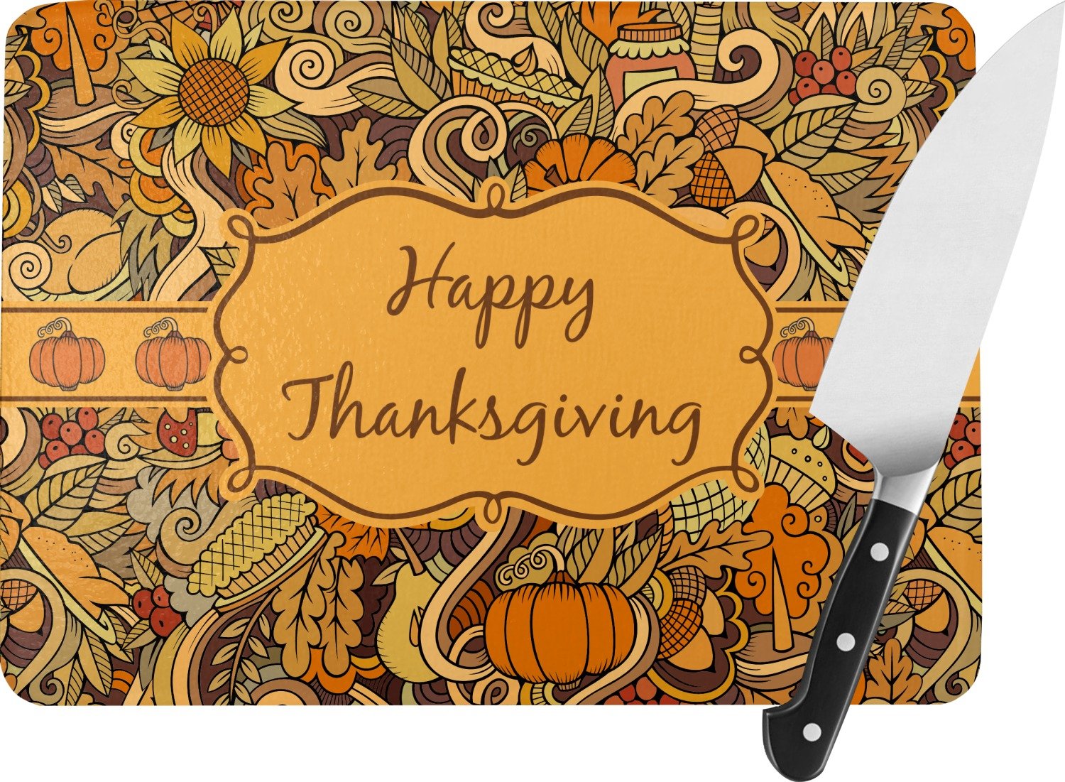 Thanksgiving Rectangular Glass Cutting Board (Large) is best for youSize:Large (Approx. 15' x 12') Leave these personalized glass cutting boards on the counter as part of your kitchen decor!! They not only have beautiful designs and personalizations, but are also very functional. The cutting boards will protect your countertops from scratches and scrapes and have a non porous surface that is easy to sanitize and clean. Give as a wedding, housewarming, or birthday gift and watch how pleased the recipient will be!!About the Design====================================This beautiful thanksgiving design is hand drawn and includes many thanksgiving as well as fall traditions. The design colors represent all the beautiful fall colors of brown and orange. We have this pattern available to you in two colors - one is in the classic fall colors of browns and oranges, while the other background is brighter and also includes more reds and greens. We have chosen to use the more classic colors - however, it is super easy to make the change in our customization system.We also chose our newest ribbon - which is a build on the classic ribbon and can include any graphic - and so we chose the pumpkin. We chose the curly label with 'Happy Thanksgiving' for our personalization. As with all our designs, the choice of background, ribbon, labels, colors and fonts is yours - you buy as is (we think our choices are stunning :-) ) or you can customize to suit your style.Features:====================================* Custom Printed with Your Design* Easy to clean* Rubber non-slip pads* Stain resistant* Non-porous surface* Available in Multiple SizesInstructions:====================================* Dishwasher Safe