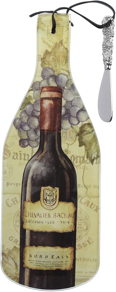 CounterArt Vineyards Wine Bottle Shaped 12-1/2 Inch Glass Cheese Board with Spreader Knife is best for youPerfect for entertaining, this cheese set from CounterArt features a sturdy tempered glass body in the shape of a wine bottle that is hygienic and shatter-resistant. The attractive, artistic wine-themed design will bring a distinctive style to your wine and cheese service at your next gathering. A cheese spreader knife is included and a leather cord is tied at the top for hanging on the wall. Non-skid feet on the bottom of this piece will hold the piece steady, and protect your countertop from scratches. Measures 12-1/2 inches by 4-3/4 inches. Dishwasher safe.
