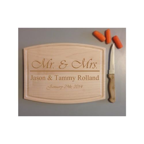 Personalized "Mr. & Mrs." Cutting Board is best for youOur Personalized 'Mr. & Mrs.' Cutting Board is made from 100% solid maple wood. These boards have a beautiful arched design to them. Our boards measure at 9' X 12' X 3/4'. The front of the board is engraved for displaying and the back of the board is left plain for cutting on. This board is perfect for Wedding gifts, Anniversary gifts, Birthday gifts, Christmas gifts, or for a just because. Our boards are perfect for cutting/chopping or serving. These boards are 100% made and engraved in the USA. ORDERING IS EASY... Once you place your order you can either add your engraving details in the note to seller section at time of checkout, or we will send you an email within 24 hours or less of your purchase asking for what you would like engraved on your new cutting board. If you have any questions, feel free to message us! PURCHASE WITH CONFIDENCE ~ CHECK OUR FEEDBACK!