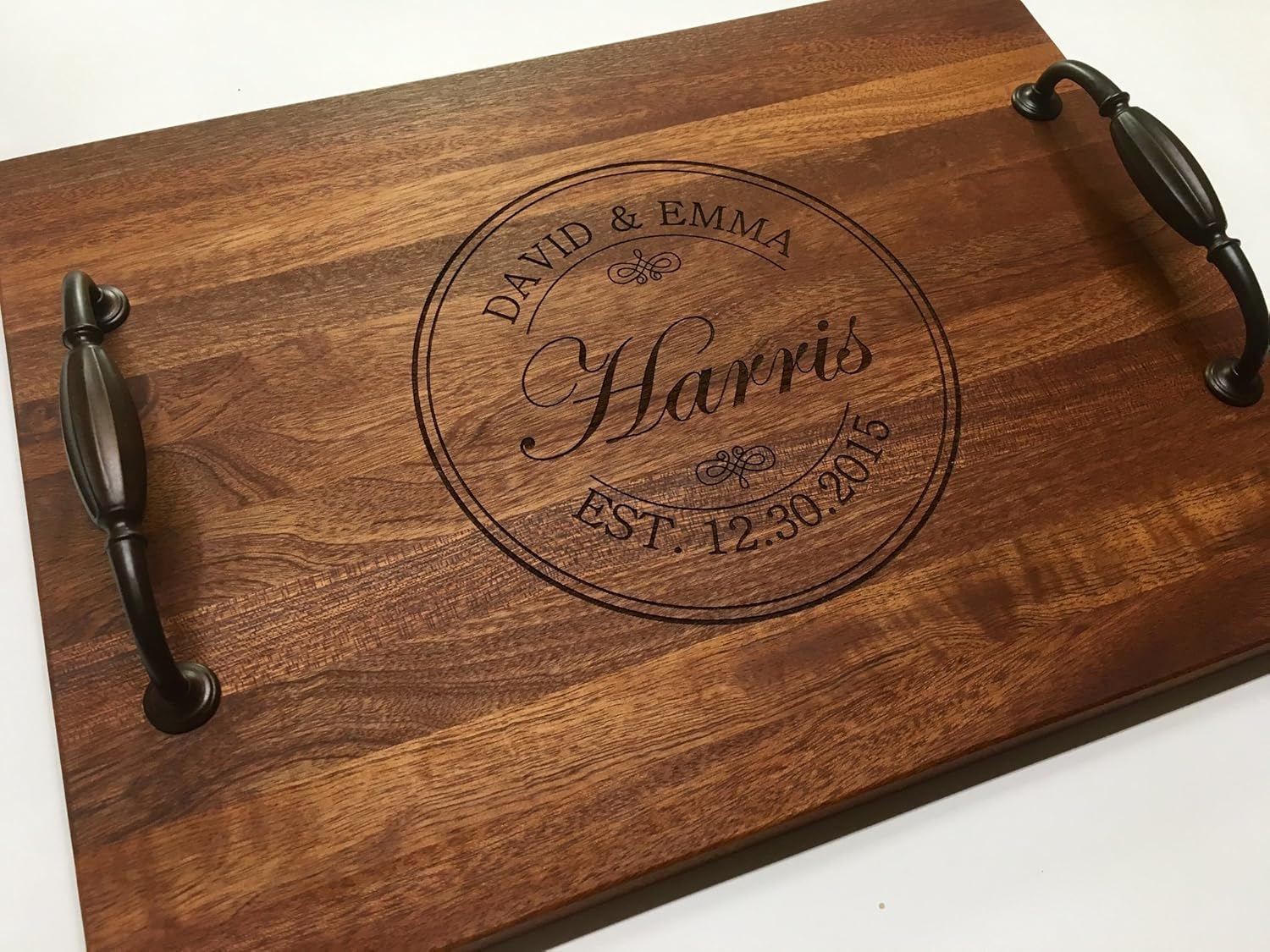Personalized Serving Tray Butler's Tray Farmhouse Tray Butcher Block Custom Gift Personalized Gift for Her Anniversary Gift Birthday Gift Christmas Gift Promotion is best for youPersonalized custom serving tray featuring the happy couples name embossed in a double circle frame. This personalized gift would would be for newlyweds, or as an anniversary, birthday, or Christmas gift. This tray can also be customized to add couples names and/or established date free of charge. SHOWN IN MAHOGANY. Dimensions: 11'x15'x3/4' and garnished with oil rubbed bronze handles.