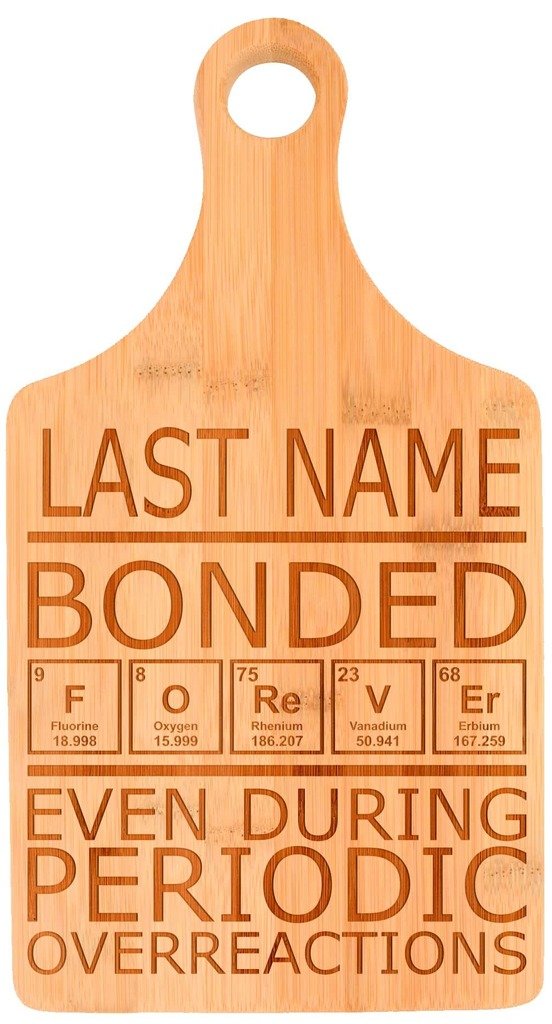 Custom Couple's Gift Enter Name Bond Forever Personalized Paddle Shaped Bamboo Cutting Board Bamboo is best for youSize:Paddle Shaped This personalized gift makes a perfect wedding gift or bridal shower gift. This bamboo cutting board is pre-oiled for lasting durability. Whether on duty or on display, this beautiful laser engraved cutting board is sure to please. Because every piece of wood is unique, the final engraved product may be slightly lighter or darker than pictured. Bamboo is stronger than hardwood, easier on kitchen knives, and is more sustainably harvested than traditional hardwoods. Cutting boards make a perfect wedding gift, anniversary gift, or birthday gift for a home chef. Cutting boards are perfect for kitchen wall decor.