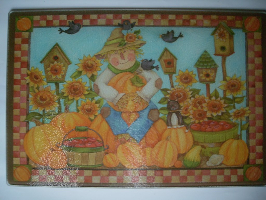 12"x8" Scarecrow Surronded By Pumpkins Kitchen Art Tempered Glass Cutting Board is best for youKitchen Art tempered glass Fall Scarecrow Surronded By Pumpkins Cutting Board *Great for the Holiday Season and every day *The Cutting Board measures Approx.11.75'LX7.75'W * EASY CLEANING/STAIN HEAT ODOR RESISTANT/SERVING TRAY/MAKING PASTRIES * Silicone Tabs on the back of the cutting board to help prevent sliding *THIS BEAUTIFUL THANKSGIVING CUTTING BOARD is Made in China