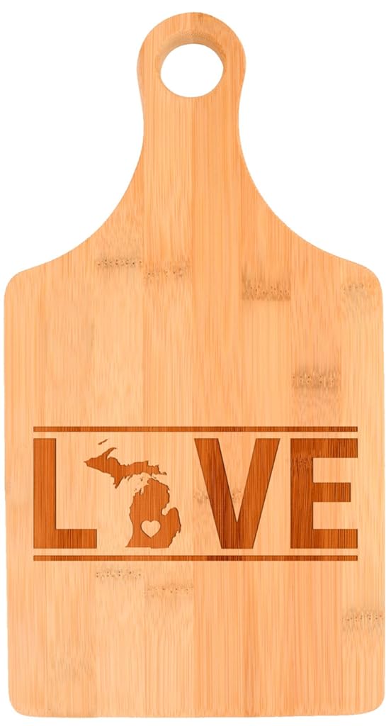 Housewarming Gift Michigan State Pride Couples Wedding Gift Paddle Shaped Bamboo Cutting Board is best for youSize:Paddle Shaped A great wedding gift or housewarming gift while also showing your state pride. This bamboo cutting board is pre-oiled for lasting durability. Whether on duty or on display, this beautiful laser engraved cutting board is sure to please. Because every piece of wood is unique, the final engraved product may be slightly lighter or darker than pictured. Bamboo is stronger than hardwood, easier on kitchen knives, and is more sustainably harvested than traditional hardwoods. Cutting boards make a perfect wedding gift, anniversary gift, or birthday gift for a home chef. Cutting boards are perfect for kitchen wall decor.