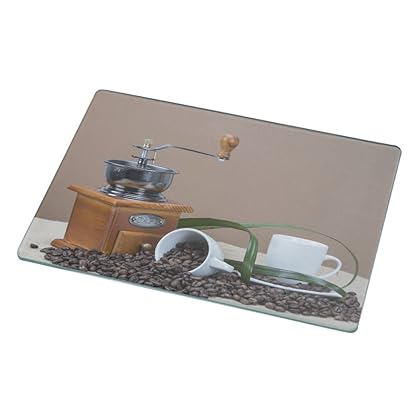 Rikki Knight Coffee Grinder and Cups on Some Bean Large Glass Cutting Board is best for youThis eye catching Tempered and coated Glass Cutting Board by Rikki Knight measures 15.3' X 11.3' and is not only beautiful, but also very useful and practical for home chef's and restaurant owner's alike. This functional, sanitary, and heat resistant glass cutting surface is ideal for slicing, dicing, and mincing or use as a protective work space for your saucepans and hot dishes in the kitchen. The cutting board Includes self-adhesive rubber feet and when placed against the wall in a standing position, these cutting boards are ideal for decorative purposes as well! Our professional coat will ensure that it will always remain great to look at whilst making a terrific conversation piece in the kitchen. Disclaimer: All images are printed directly into the material - The Texture of the image will always be a flat surface. Any images that appears to be 3-D, textured, or glittery are flat printed images. This product is proudly printed in the USA.
