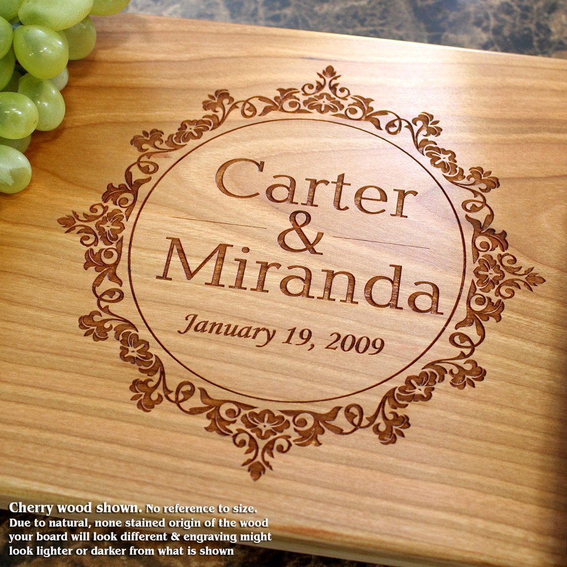 Wedding Vintage Style Personalized Engraved Cutting Board- Wedding Gift, Anniversary Gifts, Housewarming Gift,Birthday Gift, Corporate Gift, Award, Promotion. #209 is best for youOur personalized cutting boards are engraved with a beautiful design of your choice. Custom cutting board makes a perfect gift for a family, or a couple, maybe a friend, or that special someone in your life. Surprise others with a unique wedding, anniversary or housewarming gift. Show your appreciation with one of a kind party favor for you bridesmaids or groomsmen, friends or family members. In addition, a personalized cutting board would make an excellent corporate gift for a business partner or a prospective client. HOW TO ORDER: 1.SIZE : Select required size or set from the options provided. ( please, note that small size variations are possible due to our commitment to sustainable forestry. We always trying to exceed national lumber size standards whenever possible) 2.WOOD TYPE: Choose from Walnut, Cherry, Maple or Sapele. 3.PERSONALIZATION: Please, enter personalization for each line according to the 'Artwork example'. *If any line should be excluded, please put 'N/A' in corresponding field. Continued bellow in “Product Specifications”...