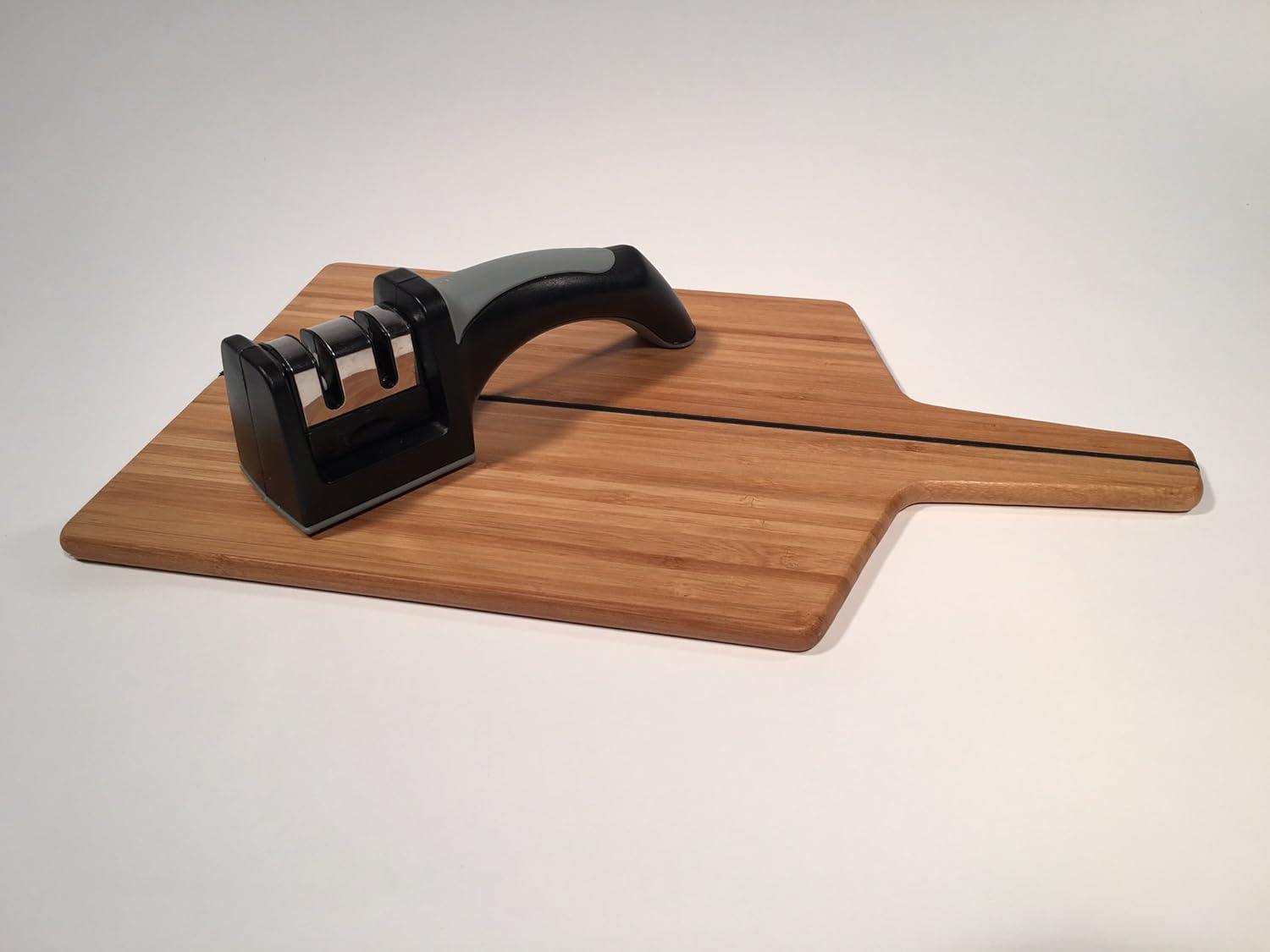 Eco-friendly Wooden Bamboo Bendable Folding Cutting Board and Black and Gray 2 Stage Kitchen Knife Sharpener System is best for youWELCOME TO THE COOK'S COMPANION FOLDING BAMBOO CUTTING BOARD AND KNIFE SHARPENER! Cooking should be a fun, safe and enjoyable experience. This folding bamboo cutting board and the 2-way knife sharpener were put together to add EASY to your fun, safe and enjoyable cooking. Why choose this cutting board set? The all-natural bamboo cutting board has a solid and durable construction with a silicone seam up the middle allowing you to fold and more securely move your fresh produce. This way you can take the cutting board from your prep area to the pan and easily transfer your delectable morsels without dropping or spilling onto your cook surface or the floor! There is no joy in extra cleanup or worse, missing a bite of your wonderful dish. It is important to know that a sharp knife is more safe to use than a dull one. It takes much less effort and pressure to cut things which helps to eliminate slips and jagged cut pieces of food. The 2-stage knife sharpening system allows you to bring life back to an old or cheap blade and look like a pro with a nice, fine cut. Simply place the blade in the coarse groove and with easy pressure, draw the blade handle to point. Repeat until the draw is smooth. A light touch is key! Then move to the fine groove and repeat the same steps. Just a few strokes and you are ready to go. Quick. Easy. We have included use and care instructions for the Cook’s Companion cutting board. Incredible quality at a great price! Comparable to many of the higher priced bamboo cutting boards! Makes a great gift for the culinary artist in your life! Click ADD TO CART to get your cutting board set today!
